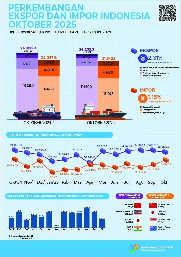 Neraca perdagangan Indonesia Januari–Oktober 2025 mengalami surplus US$35,88 miliar yang berasal dari surplus sektor nonmigas US$51,51 miliar, sementara sektor migas defisit senilai US$15,63 miliar.